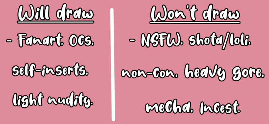 - These commissions are purely for personal use. (Using it as an icon, header, banner, background, etc.) Commerical/NFT use is prohibited.